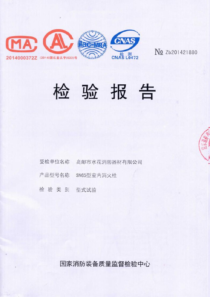 I plant was founded in June 1976, the existing staff of 600 people,including all kinds of technical and management staff of 68 people.With 50 millon yuan in fixed assets,covers an area of over 35,000 square meters,construction area of over 25,000 square meters.The establishment of a sound quality system. made a variety of "measurement of qualified certification",and become Jiangsu and more provinces of the fire association member units.Factory strong technical force,production and testing equipment,advanced technology.Production "water flower"brand water with intertace:KDK65,KD65,KY65,KN65.Fire water gun:QZG3.5/7.5,QZ3.5/7.5,QP8/0.7Z foam water gun.Indoor fire hydrant:SN65,SNW65-1,SNZ65,SNZW65-1.Fire hose reel JPS0.8-19/25.Production of "postal" card,fire with lining water:65-8,10,13.16,20,25 type;80-16,20,25 type.Water interface:KD50,65;KY50,65;KN65.Fire water gun:QZ3.5/7.5.5.Indoor fire hydrant:SN65,SNW65-1,SNZ65,SNZW65-I.And in May 2015 through the Ministry of Public Security Fire Product Conformity Assessment Center 3C version of the inspection access to all of the above products,mandatory certification,to allow the production and marketing,product marketing throughout the country,praised by the majority of users.